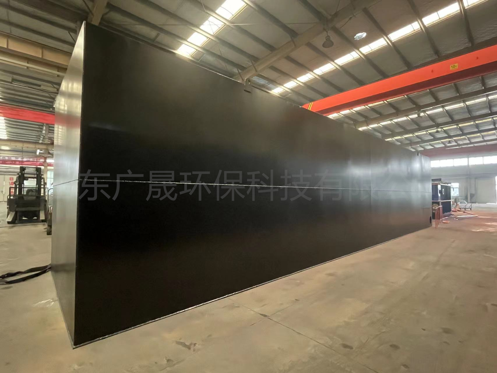 其一側設置有進水口,反應池內設置有浸沒式簾式膜組件,容納有活性污泥,周邊曝氣和膜片曝氣管路與風機聯通,膜組件上配套的集水管與抽吸泵聯通,待處理的污水通過進水口進入 MBR 生化反應池,污水在反應池內的 HRT 為 5h。經反應池內的活性污泥降解后,通過抗污染平板膜組件,然后由抽吸泵吸出進入清水消毒池。反應池內還設置有污泥提升泵,可以把多余的污泥提升到污泥硝化池內。反應池上部開有溢流口,可以使污水自流到箱外調節池。下部一側開放空口,便于池內結構維護、清理。