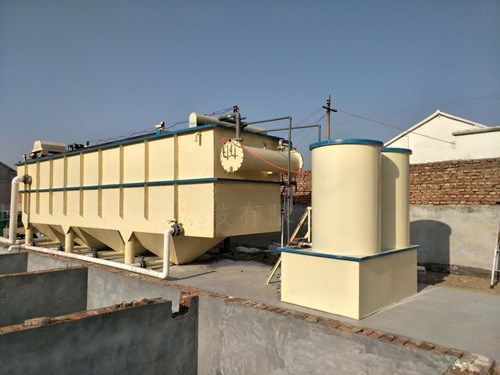 (2)氣浮機:經加藥反應后的污水進入氣浮的混合區,與釋放后的溶氣水混合接觸,使絮凝體粘附在細微氣泡上,然后進入氣浮區。絮凝體在氣浮力的作用下浮向水面形成浮渣,下 層的清水經集水器流至清水池后,一部分回流作溶氣使用,剩余清水通過溢流口流出。氣浮池水面上的浮渣積聚到一定厚度以后,由刮沫機刮入氣浮機污泥池后排出,氣浮底部的淤泥定時間用抽糞車吸出外運,或者是打開排污閥自流入污泥收集池,用污泥脫水機脫水處理,從而減少二次污染,安全可靠。